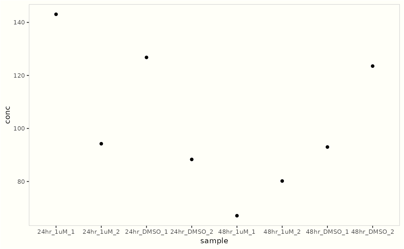 ggplot(dummy_rna_conc, aes(x = sample, y = conc)) +